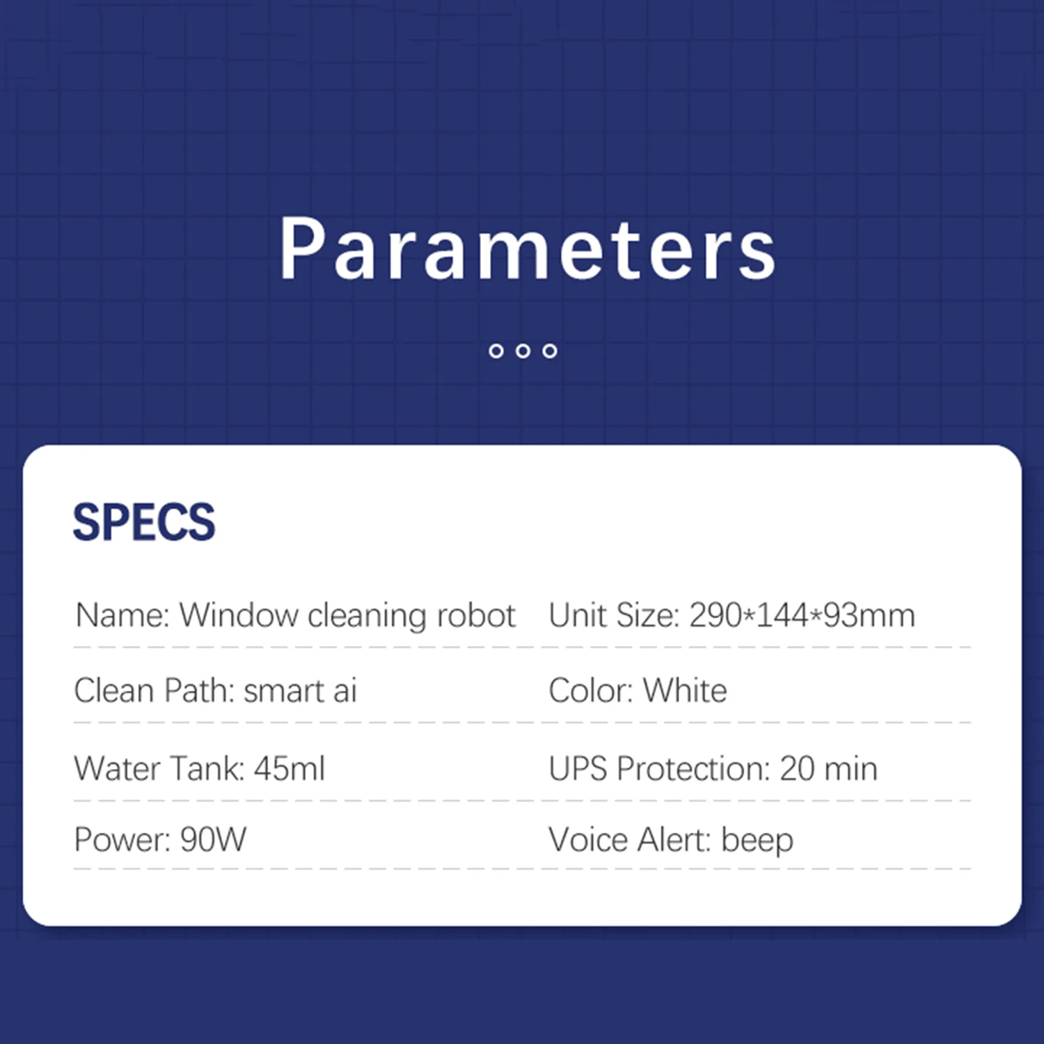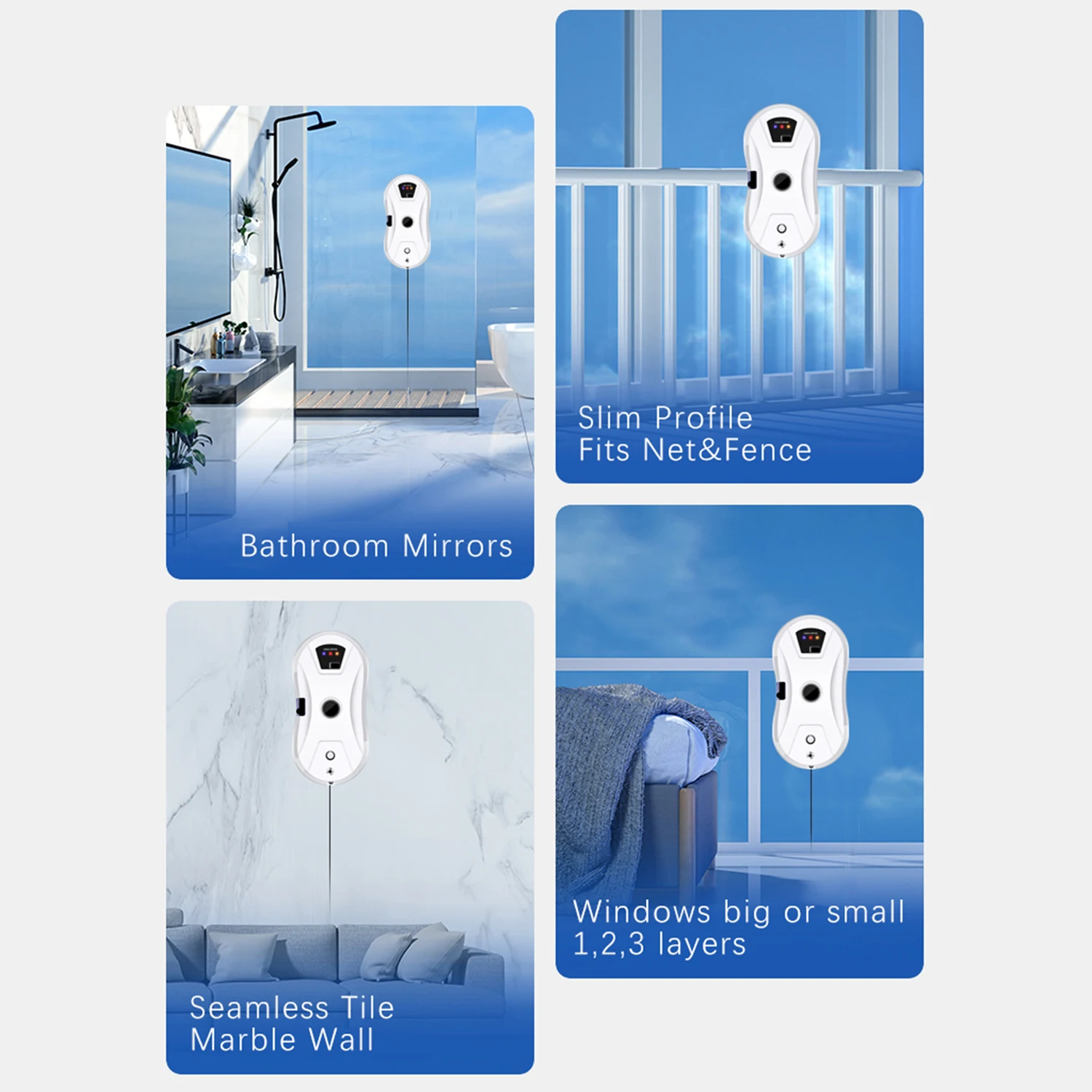 Gracias a su gran potencia de succión, el robot se adhiere firmemente al vidrio, eliminando fácilmente polvo, manchas y suciedad. Funciona de forma silenciosa y es apto para múltiples superficies lisas como cristal, azulejos e incluso puertas de madera.