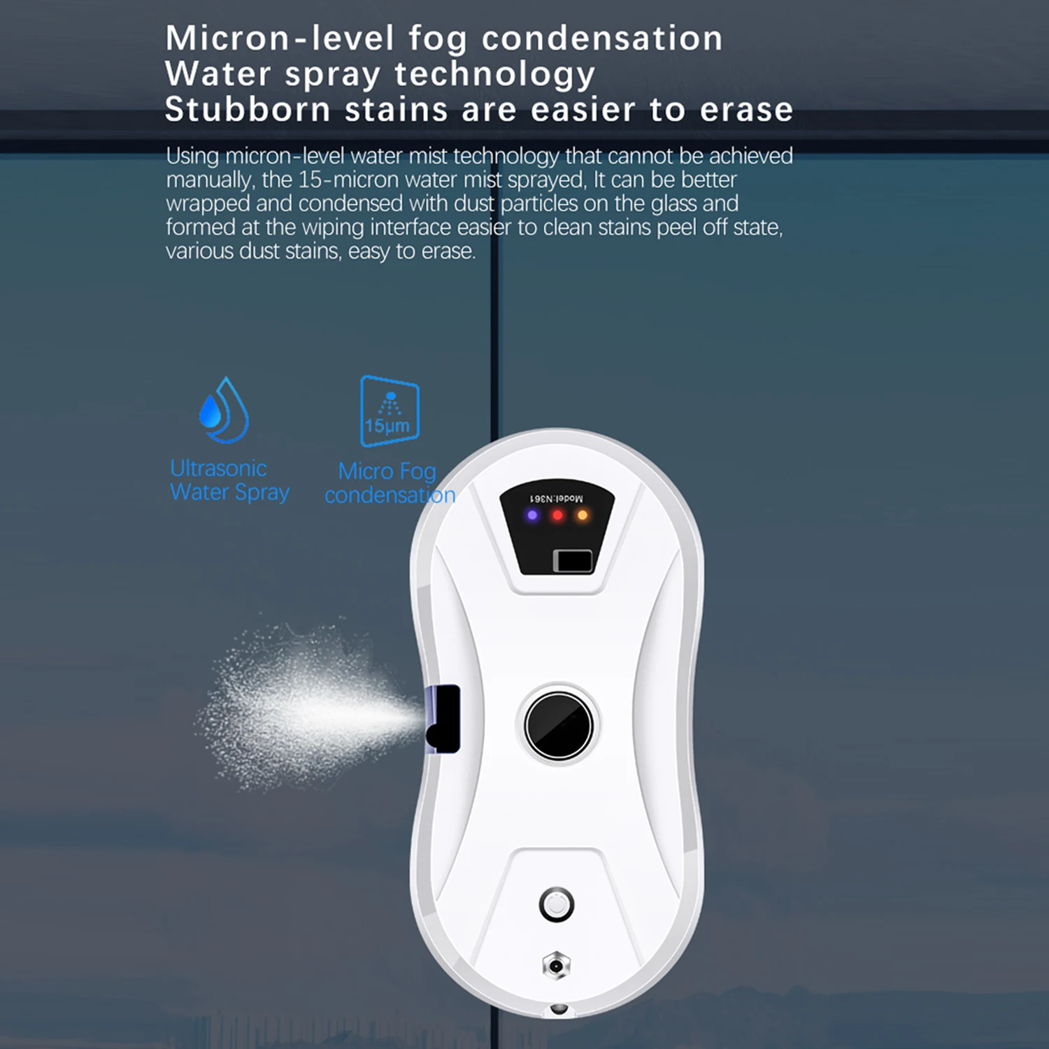 Este innovador robot limpiacristales incorpora una función de pulverización ultrasónica que garantiza una limpieza impecable. Rocía una amplia superficie para mantener el vidrio húmedo y optimizar los resultados. Puedes elegir entre modo automático o manual mediante el control remoto. Su depósito de 30 ml proporciona suficiente agua para limpiar todas las ventanas de tu hogar.