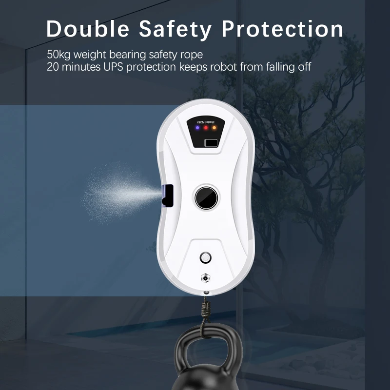 Incluye batería de litio integrada que mantiene el robot adherido durante 20-30 minutos en caso de corte eléctrico, junto con una alarma de aviso. Además, incorpora cable de alimentación reforzado y cuerda de seguridad tipo escalada para evitar caídas, ideal para ventanas en altura.